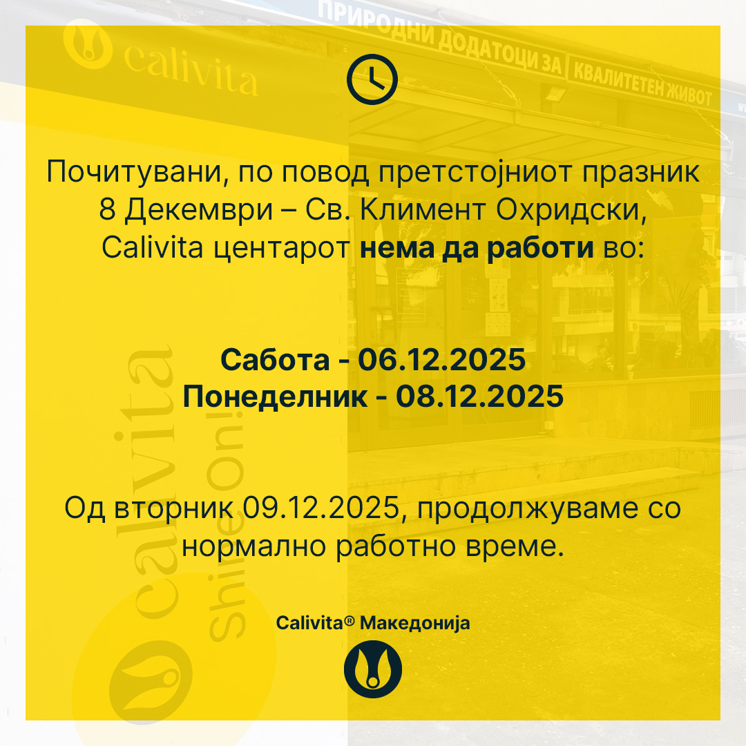 Почитувани, по повод претстојниот празник 8 Декември – Св. Климент Охридски, Calivita центарот нема да работи во: Сабота – 06.12.2025…