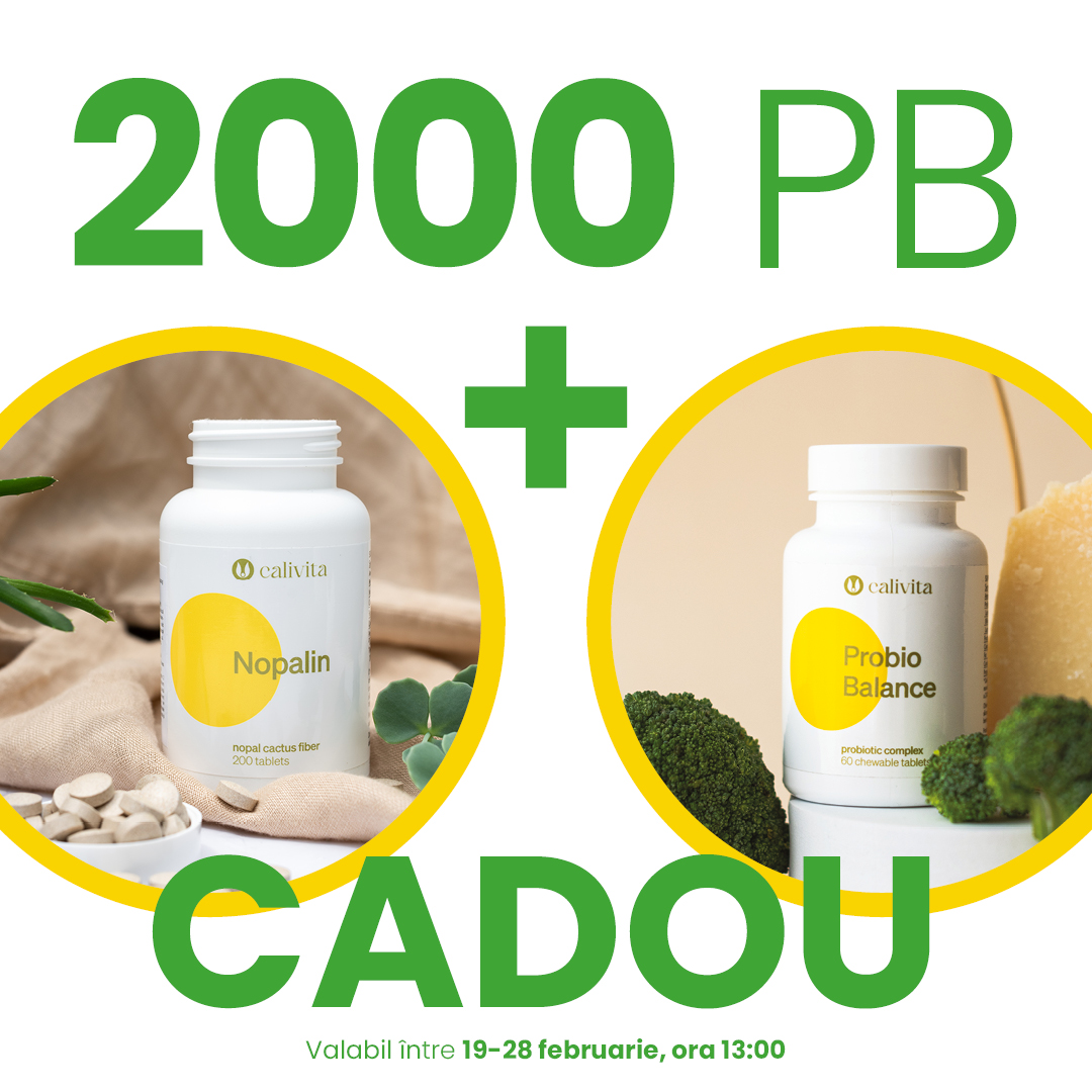 Cadou la 2000 PB: Adaugă în coş produsele preferate în valoare de 2000 Puncte Bonus, iar noi îţi oferim cadou un Nopalin şi un ProbioBalance, pentru susținerea digestiei, controlul greutății și echilibrul florei intestinale.